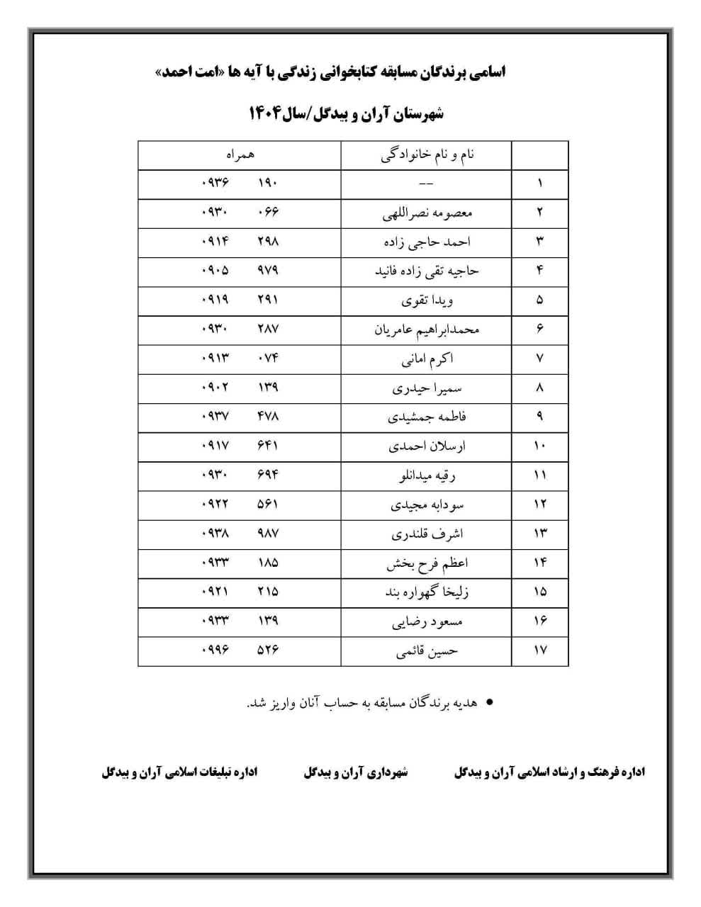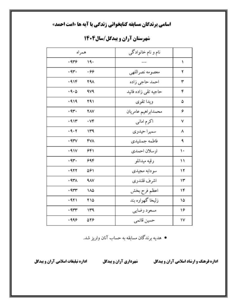 رئیس اداره تبلیغات اسلامی شهرستان آران و بیدگل از اعلام اسامی برندگان مسابقه بزرگ کتابخوانی قرآنی «زندگی با آیهها» با عنوان «امت احمد» خبر داد و گفت: این مسابقه با هدف ترویج سیره نبوی و بازشناسی هویت امت اسلامی برگزار شد.