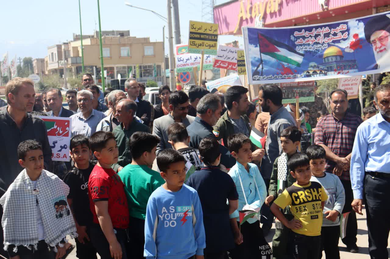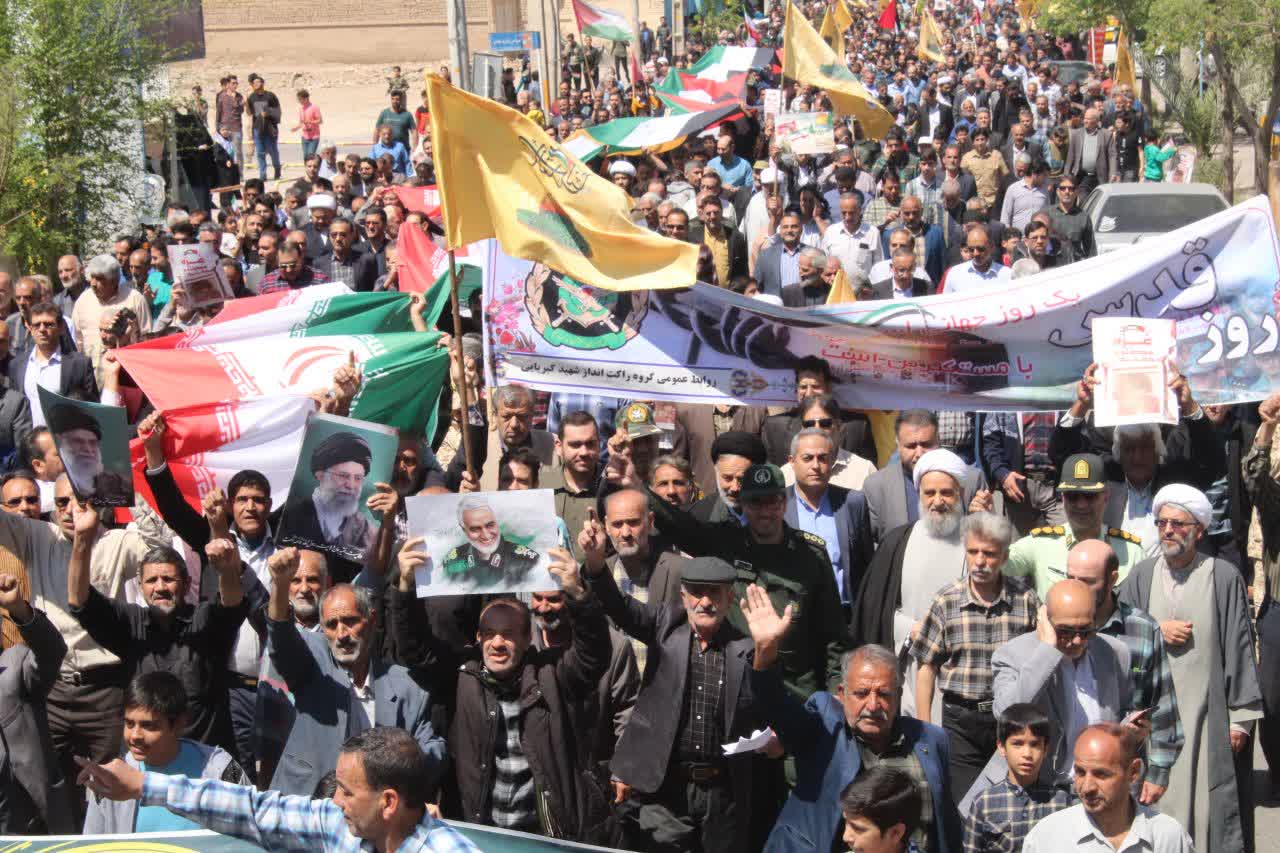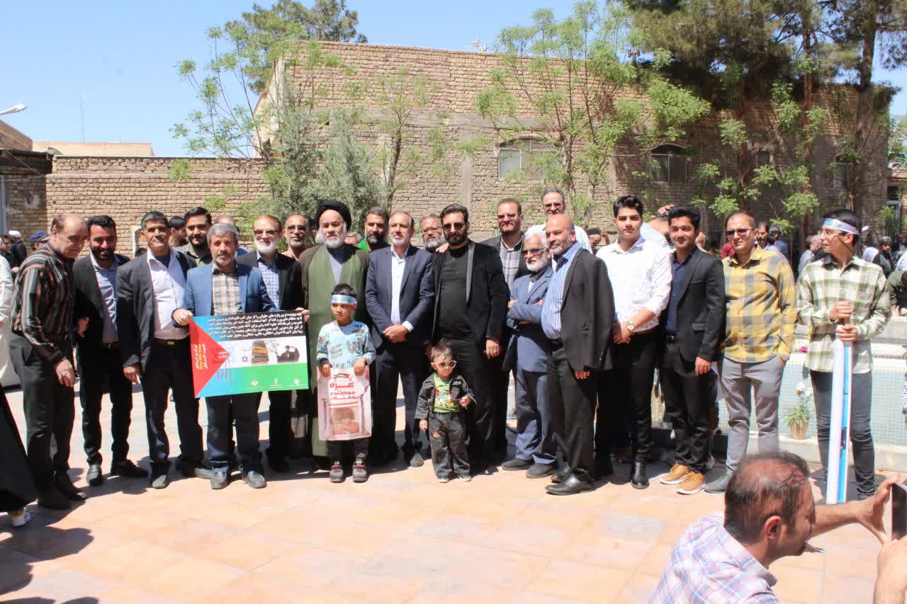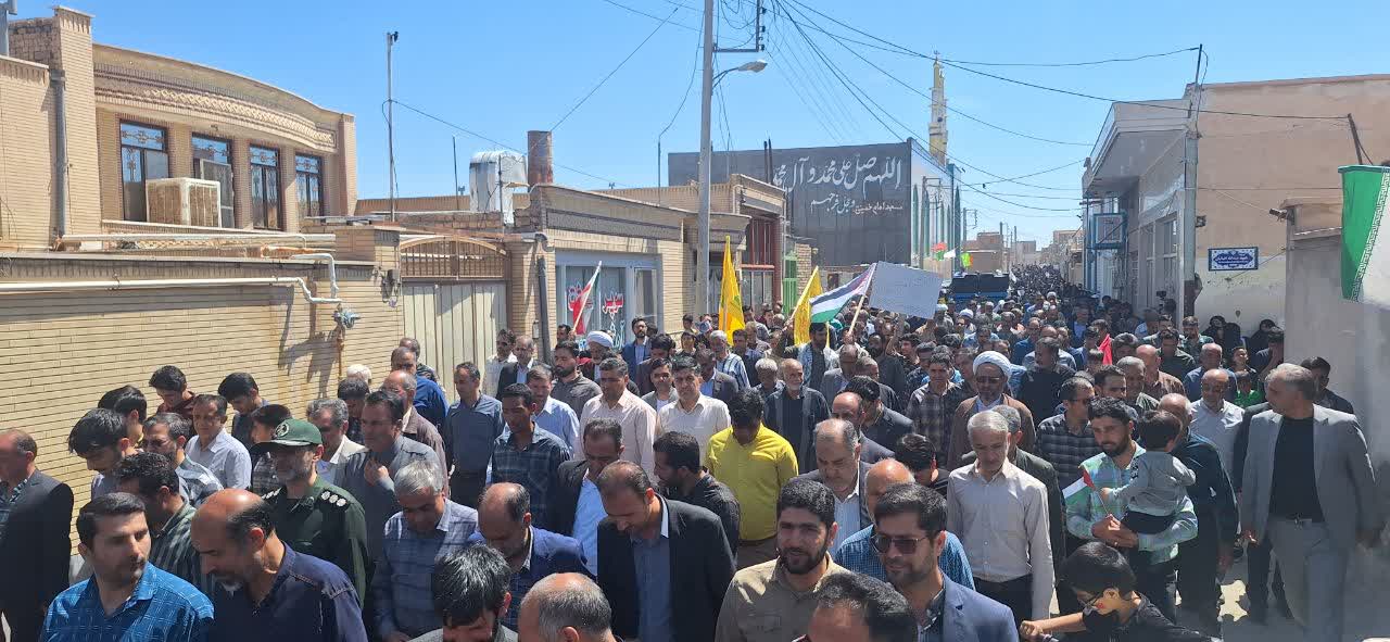 روز جمعه ۱۷ فروردین‌ماه ۱۴۰۳ مصادف با ۲۵ماه مبارک رمضان ساعت ۱۱ صبح با حضور حماسی اقشار مختلف مردم و با هدف حمایت از مردم مظلوم فلسطین و آرمان رهایی قدس شریف و ابراز انزجار از رژیم جعلی و غاصب صهیونیستی در نقاط مختلف شهرستان آران و بیدگل برگزار شد.