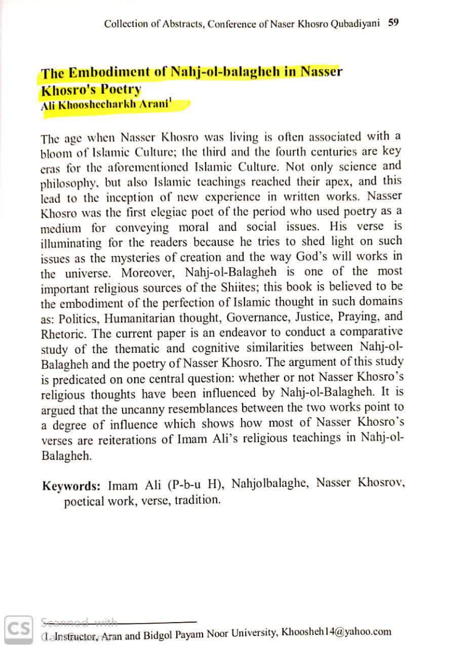 به گزارش افق نو آران و بیدگل؛ مقاله استاد علی خوشه چرخ آرانی با موضوع “بررسی تجلی نهج البلاغه در شعر ناصر خسرو” در هفته نامه شماره ۴۹ «ادبیات و صنعت» کشور تاجیکستان به چاپ رسید.
